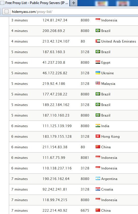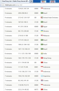 Untuk melihat daftar proxy server dari tiap negara, anda bisa kunjungi situs hidemyass.com. Selanjutnya anda masukkan proxy server dalam browser. Untuk Internet explorer klik Tools > Internet Options > Connections > LAN Settings dan beri tanda tik Use a proxy server for your LAN, masukkan IP address proxy server dan nomer port pada kolom yang disediakan, dan beri tanda tik juga Bypass proxy server for local addresses, lalu klik OK. Sedangkan untuk Firefox, klik Firefox > Options > Advanced > Network > Settings, klik Manual proxy configuration lalu masukkan IP address dan nomer port proxy server. Pada kolom No Proxy for, masukkan local network anda 192.168.1.0/24, lalu klik OK.